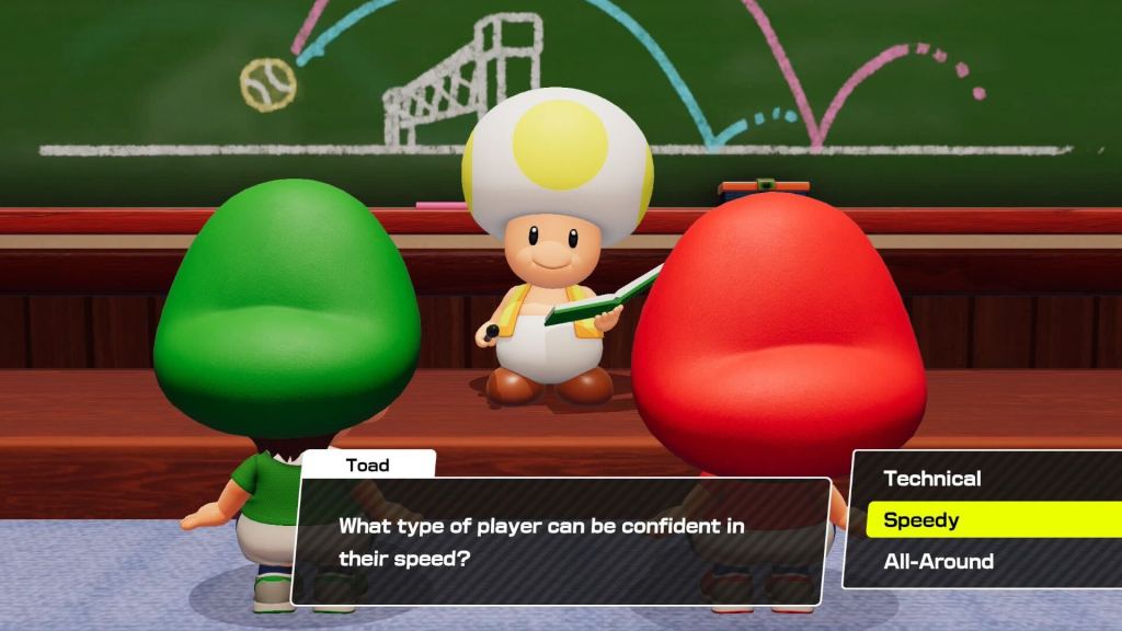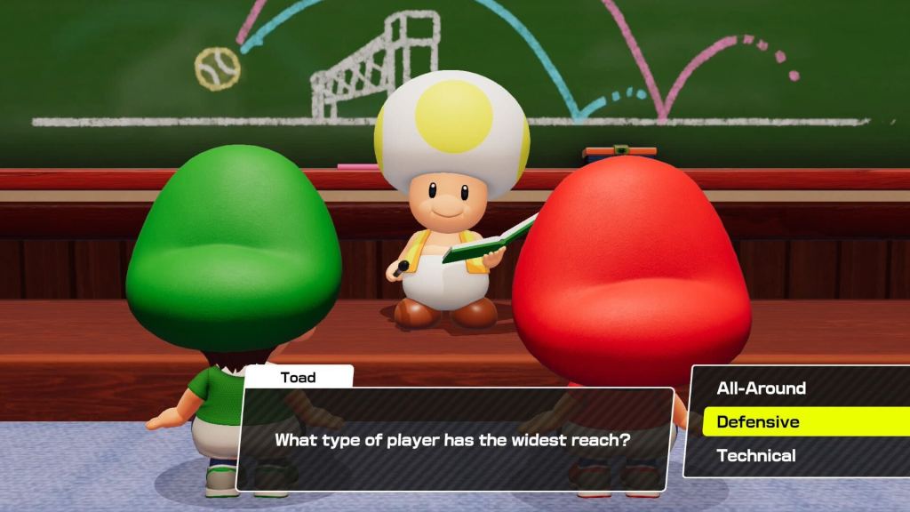 The Mushroom Tennis Academy isn’t just about on-the-court skills. In Mario Tennis Fever’s story mode, you’ll eventually need to test your knowledge in a classroom. Professor Toad will ask you a series of questions, and you have to answer them correctly to get your sticker and move on to the next assignment.