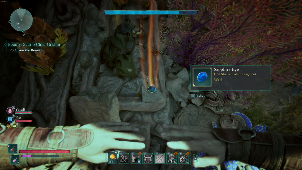 First up, we have the Totem Base, which is called the Eyes of the Obscured. This is one of the easier pieces to find, as it’s located right near the start of the map, south of Eagle’s Reach. You have to enter the Shrine to Wael to find it sitting on a mantle surrounded by coral and mushrooms. The Shrine to Wael can be reached by jumping on some rocks on the outer edge of the large pink coral that arches over the road to the south of Eagle’s Reach.