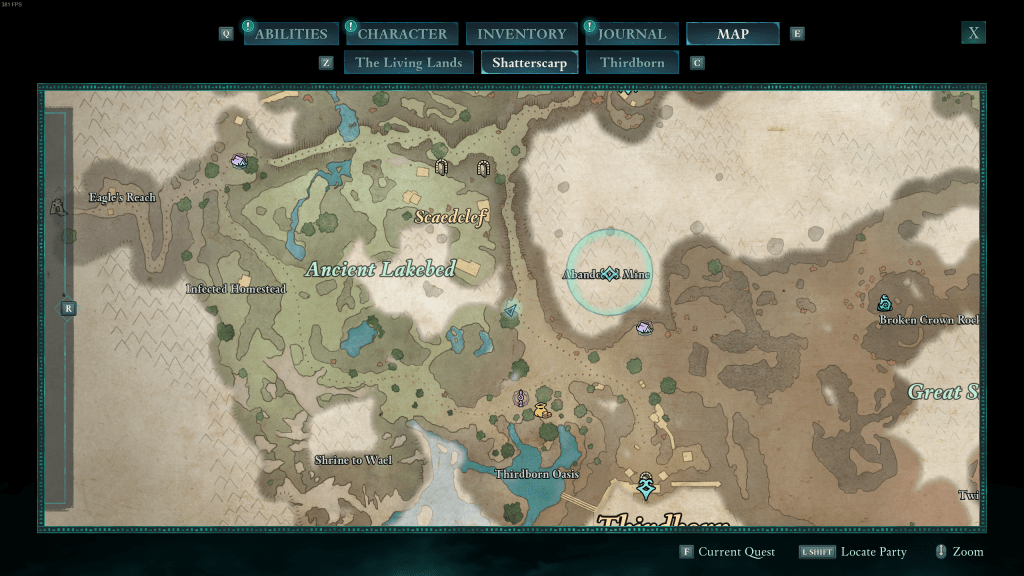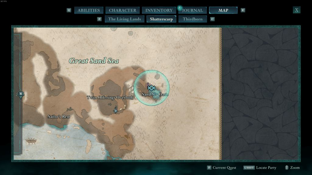 Finally, the last Totem of Revelations piece is the Sapphire Eye. Without fully exploring Shatterscarp, you would never know where this piece is located. To find it, head to the Sand Sea Oasis, which is right near the Sand Sea Ruins in the far eastern part of the map. Notably, the Sand Sea Oasis is a location you’ll visit for the One Last Drink side quest in Avowed.