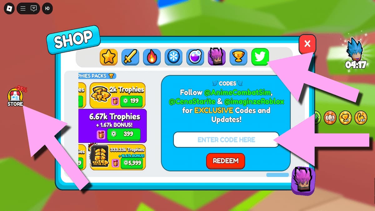 - Press the Twitter bird icon to jump straight to the Codes section.