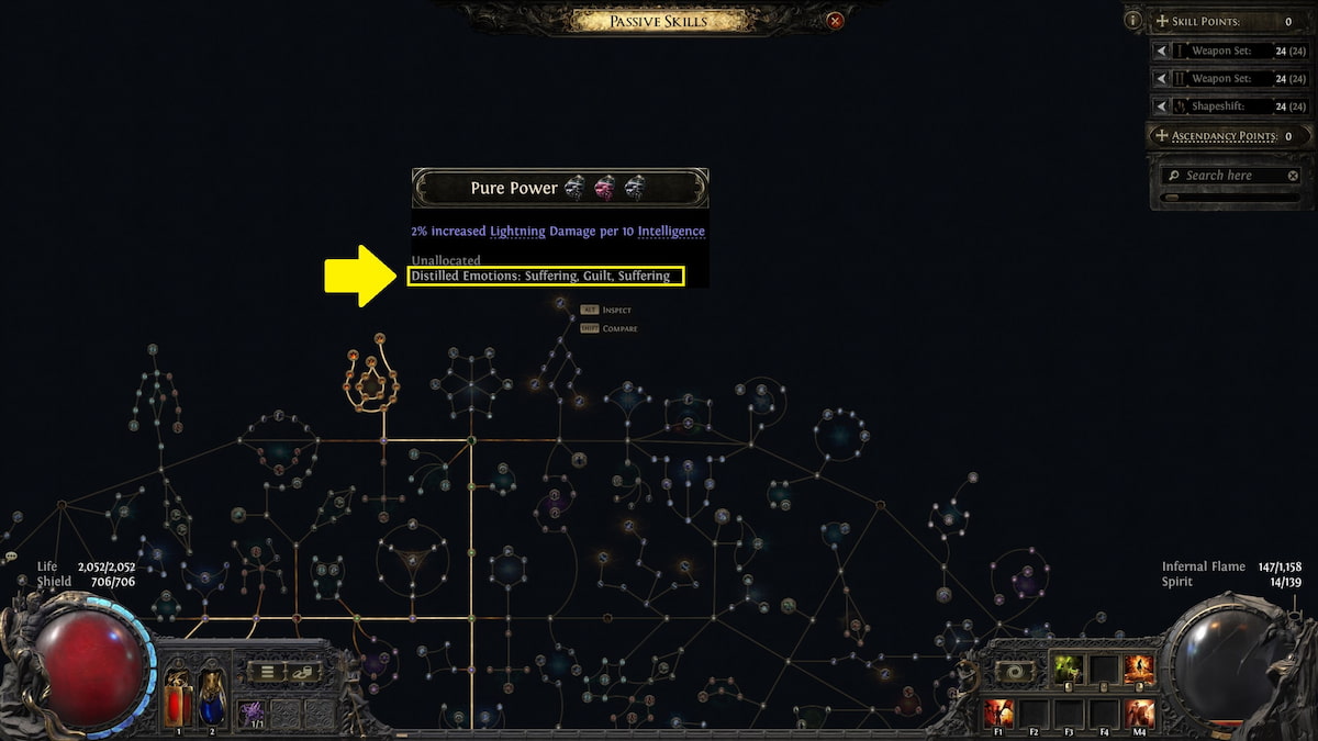 For example, if you wanted to put Pure Power on your Amulet, find it in the Passive tree, and before rolling your cursor over it, hold the ALT modifier key. While holding it, roll your cursor over Pure Power you will be able to see which Distilled Emotions you need to add to your Amulet in the right order.