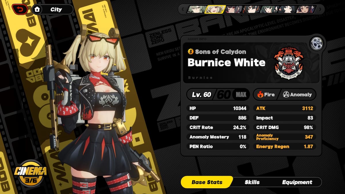 Starting with some surface-level details, Burnice is a Fire Anomaly character with a huge focus on Fire DoT (Damage over Time) and Off-field damage. You read that correctly: Burnice deals a large portion of her damage while not on the field, contrasting with every other character in Zenless Zone Zero. That isn’t to say she isn’t capable of playing like a standard DPS, however, as all of her abilities have very high damage scaling. This means that Bunrice is very flexible with her role, and has several teams and gear setups where she can excel.
