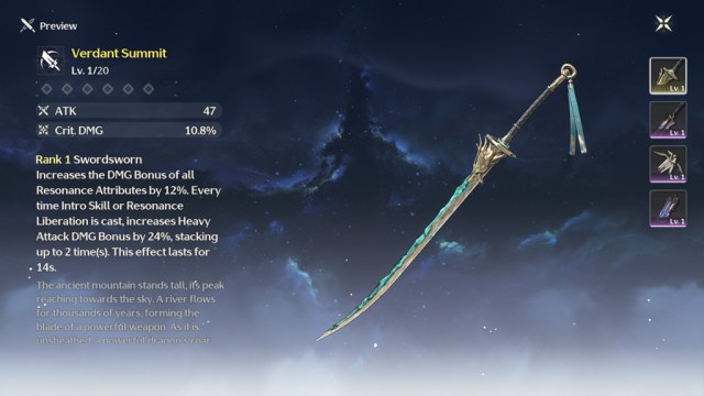 The best weapon for Calcharo in Wuthering Waves is Jiyan’s signature 5-star Verdant Summit. The weapon excels by providing him with a 12% boost in Electro DMG and a total of 48.6% Crit DMG —the latter when at level 90. The 5-star will also allow you to strengthen the damage of his Mercy Heavy Attack by up to 48%.