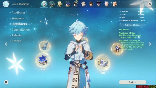 4NO allows Chongyun to buff his team’s ATK when he uses his Burst. This is the generally recommended set for most Chongyun teams.