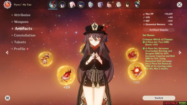 4GD gives Hu Tao a metric boatload of Elemental Mastery, depending on her team. While not quite as potent as the two sets above, it’s still perfectly fine to use if you’d rather farm this domain instead.