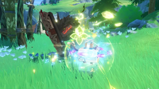 Kirara generates a shield when you tap her Skill button, which persists even when Kirara is off-field. Tap Kirara’s Skill, and then switch to your teammates. Her shield absorbs damage and provides interruption resistance for 12 seconds or until it’s broken. You can use her Burst, too, if you have the Energy for it, but Kirara’s Burst is optional.