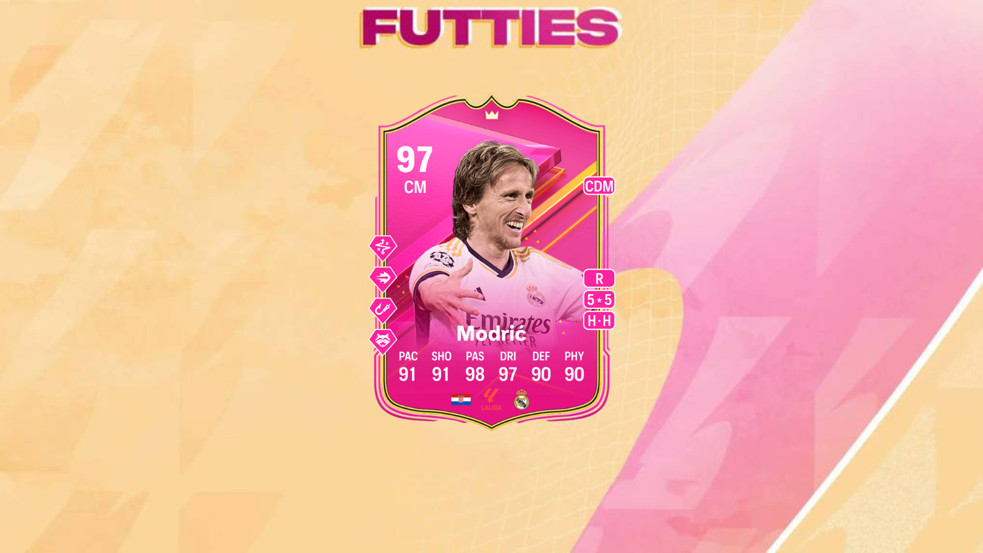 It’s hard to say anything negative about the Luka Modric Futties SBC, which features a 97-rated CM item, with H-H work rates. It has four of the best playstyle+ possible for a central midfielder, and has 90+ value in all six face stats.