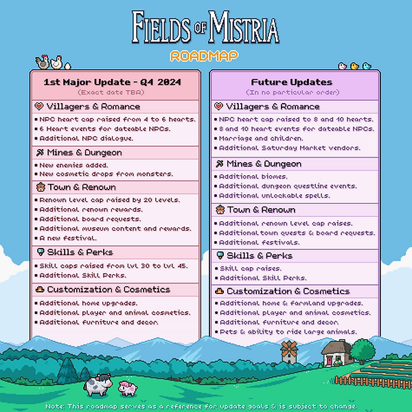 As this is an Early Access roadmap, there is the possibility that time frames may change and the update schedule may alter slightly. Regardless, this roadmap provides a good idea of what players of Fields of Mistria have to look forward to from the game.