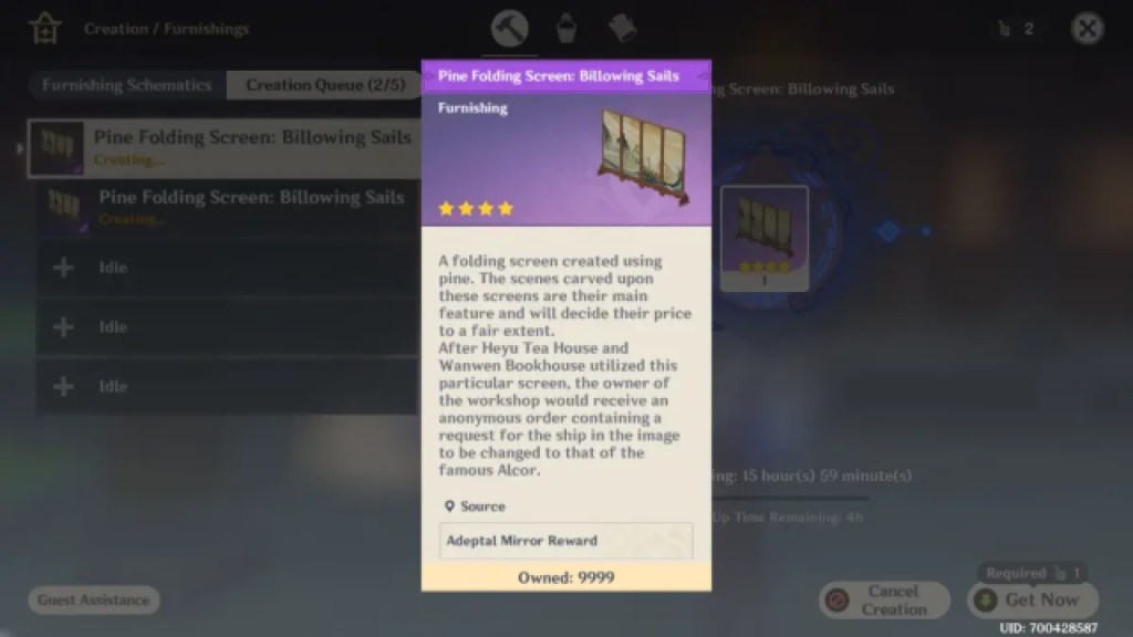 Except the game wouldn’t let them. Their inventory was full on this particular item. Oops. The crafting slots couldn’t be cleared without claiming the finished screens, but furniture can’t be deleted from the inventory either. Stalemate. Enmityaz can no longer craft anything in their Serenitea Pot, folding screen or otherwise. Their furniture crafting function is as good as bricked.
