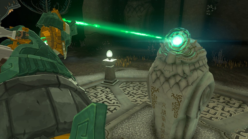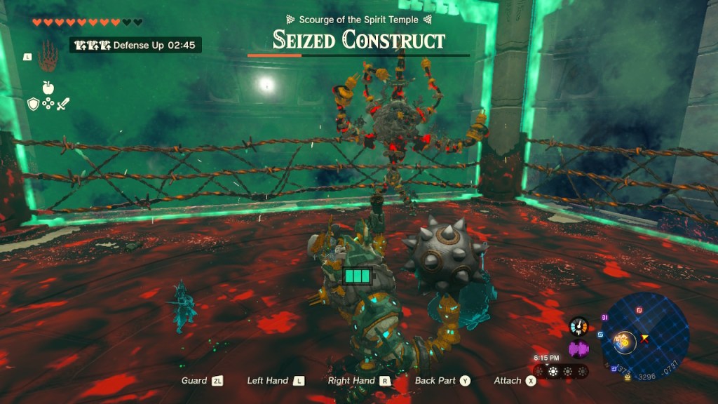 The Seized Construct will approach you and attempt to melee you. Each hit will take health of off Link, and since the ground is entirely comprised of gloom, you need to stay on the mech the whole time. This is mitigated by the fact that the Seized Construct is highly susceptible to mech attacks: even if you’re not using a melee weapon. Your job is to slam it into the arena walls, which will electrocute it and deal it massive damage.