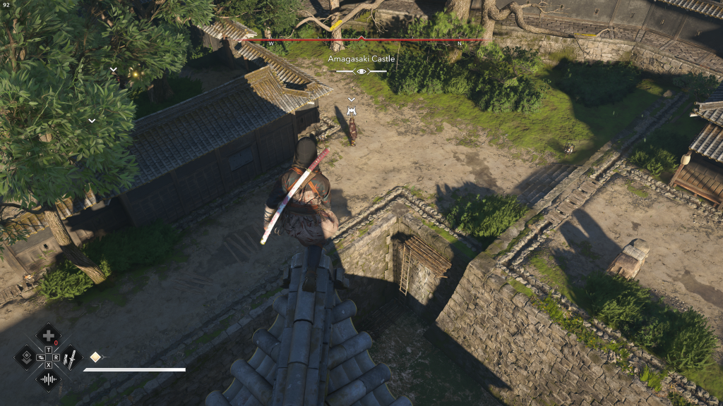 The castle grounds in Amagasaki are massive. They stretch hundreds of meters in every direction. There are interconnected rivers that make up moats surrounding the different areas of the castle, making it difficult to navigate the grounds. Fortunately, you can enter Amagasaki Castle without alerting a guard by climbing on a tree and hopping over the wall on the eastern and western sides of the castle.