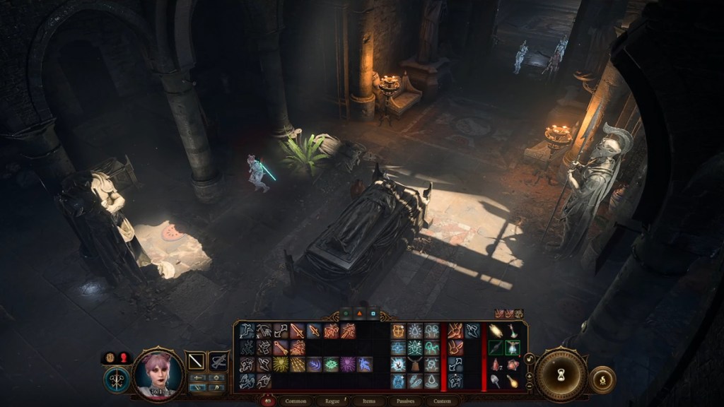 Back in the main chamber will be several skeletal remains. Loot these bad boys and head to the center of the sunken section. On the left side of the central statue will be a button. Pressing it will animate those spooky skeletons and trigger initiative. If you looted them earlier, their attack options are limited, but they’re still plenty deadly.