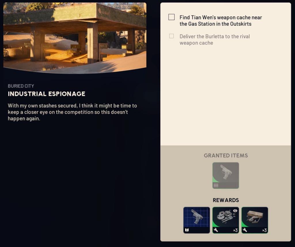 The Burletta blueprint will allow you to craft the pistol whenever you have the supplies and the need for it, so this quest is definitely worth doing. Here’s where to find Tian Wen’s weapon cache in Buried City for the Industrial Espionage quest to get your own blueprint.
