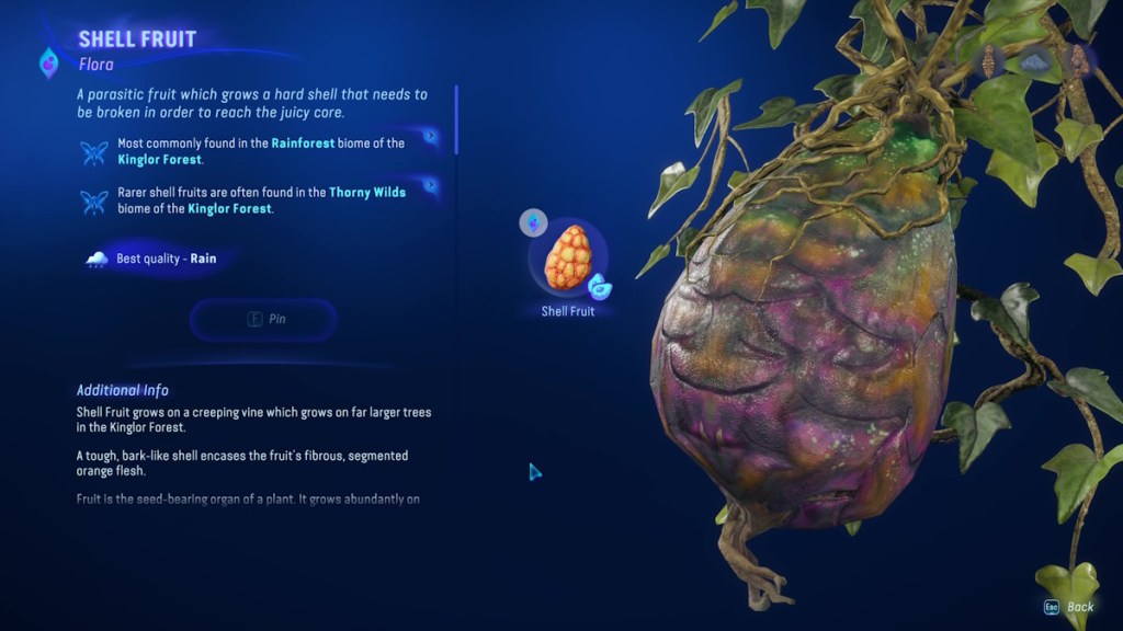 Head north-northwest until you reach the Thorny Wilds Biome. According to the Hunter’s Guide, the fruit is on a “creeping vine which grows on far larger trees.” Look for large trees and use your Na’vi senses to spot the fruit.