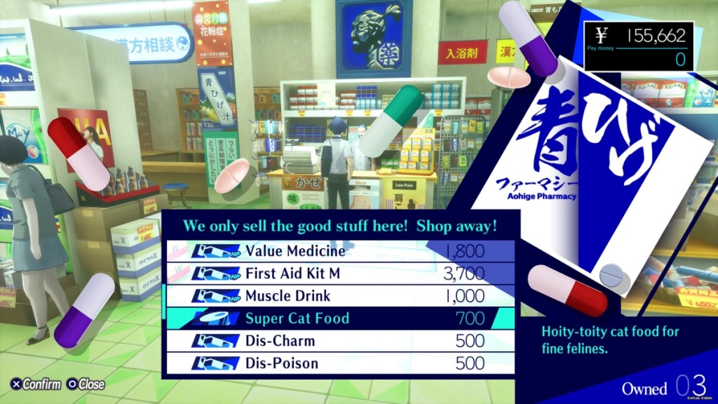 You’ll find cat food, specifically Super Cat Food, at Aohige Pharmacy for ¥700. You can actually purchase it prior to unlocking the quest, so stock up if you can. If you’re a bit low on money, go to the Pharmacy on a Saturday during their weekly sale.
