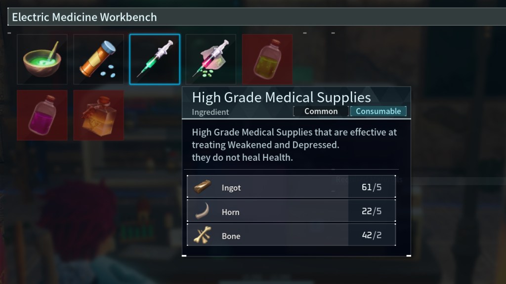 Palworld is truly a fantasy world in that there is a dedicated medicine with a 100% success rate for curing depression. At level 12, you can unlock the Medieval Workbench from the Technology tree. Both that and the Electric Medicine Workbench (unlocked at level 43) allow you to manufacture High Grade Medical Supplies. This item is guaranteed to cure what ails your Pal.
