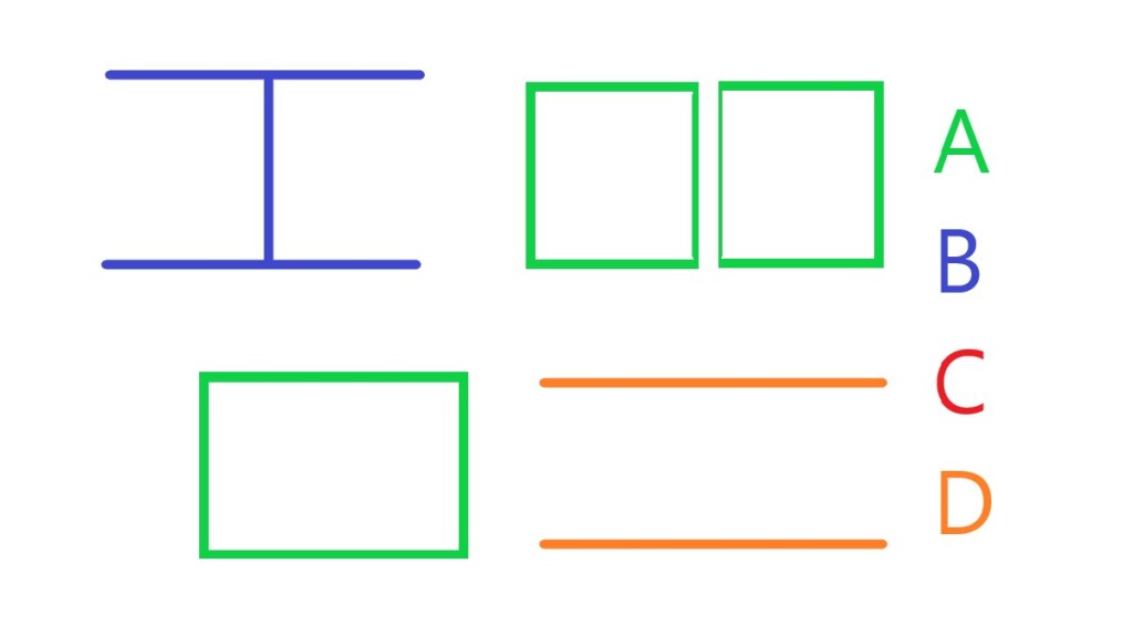 And if you want to see exactly how these are determined, here’s a quick breakdown of each “style” that appears on the two running trains (C is entered by process of elimination). The trip-up here is that “A” can appear as either a single rectangle or as two rectangles next to each other: