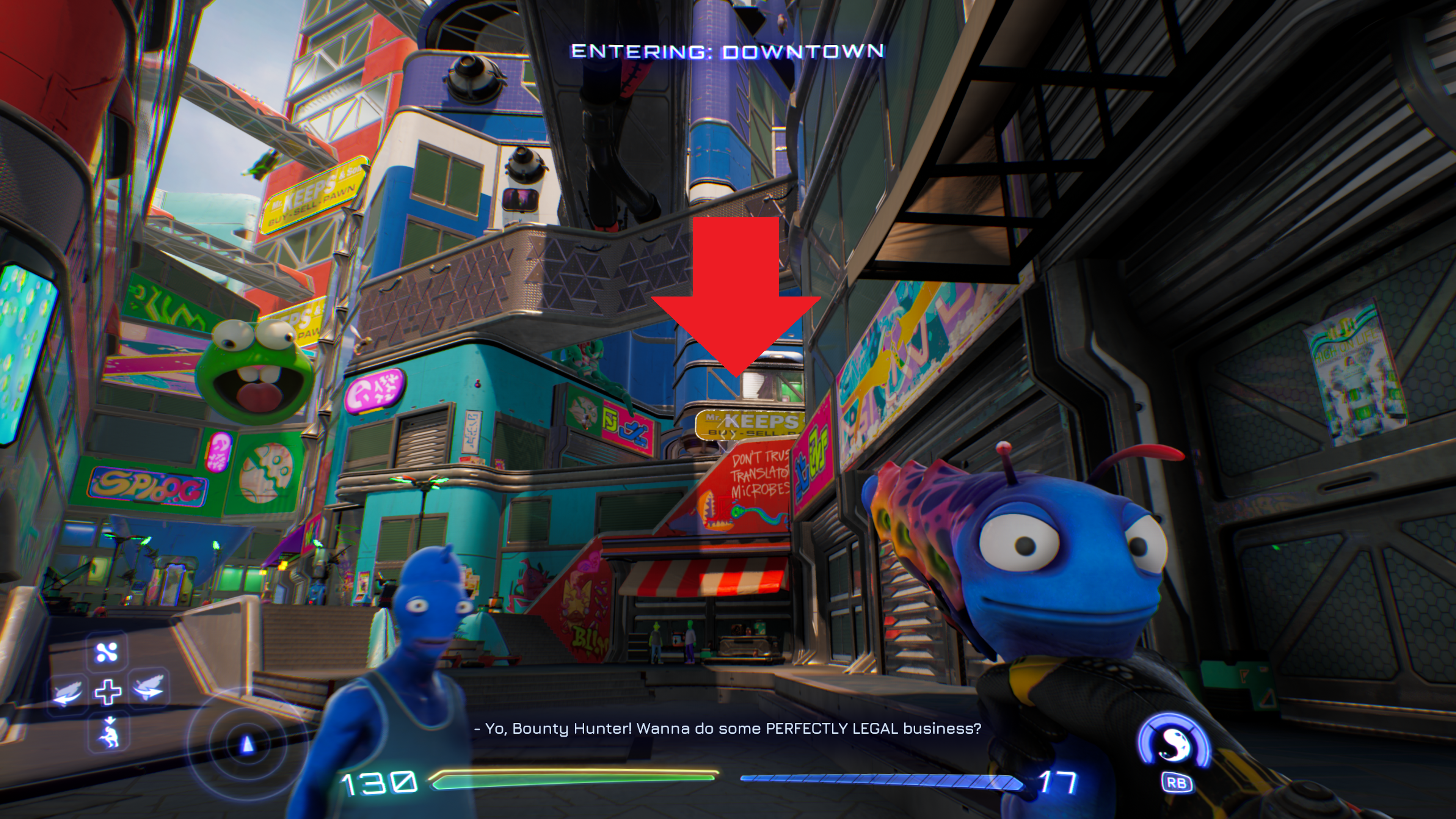 After that, Gene will ask you to go to the local pawn shop in Blim City (location above), which will net you a pre-order on the jetpack via a reservation. Don’t worry, it’s another one of High on Life‘s meta jokes. Go back home as the questline asks you to do, go to sleep in your room, and enough time will have passed: you’ll have access to the jetpack from then on.