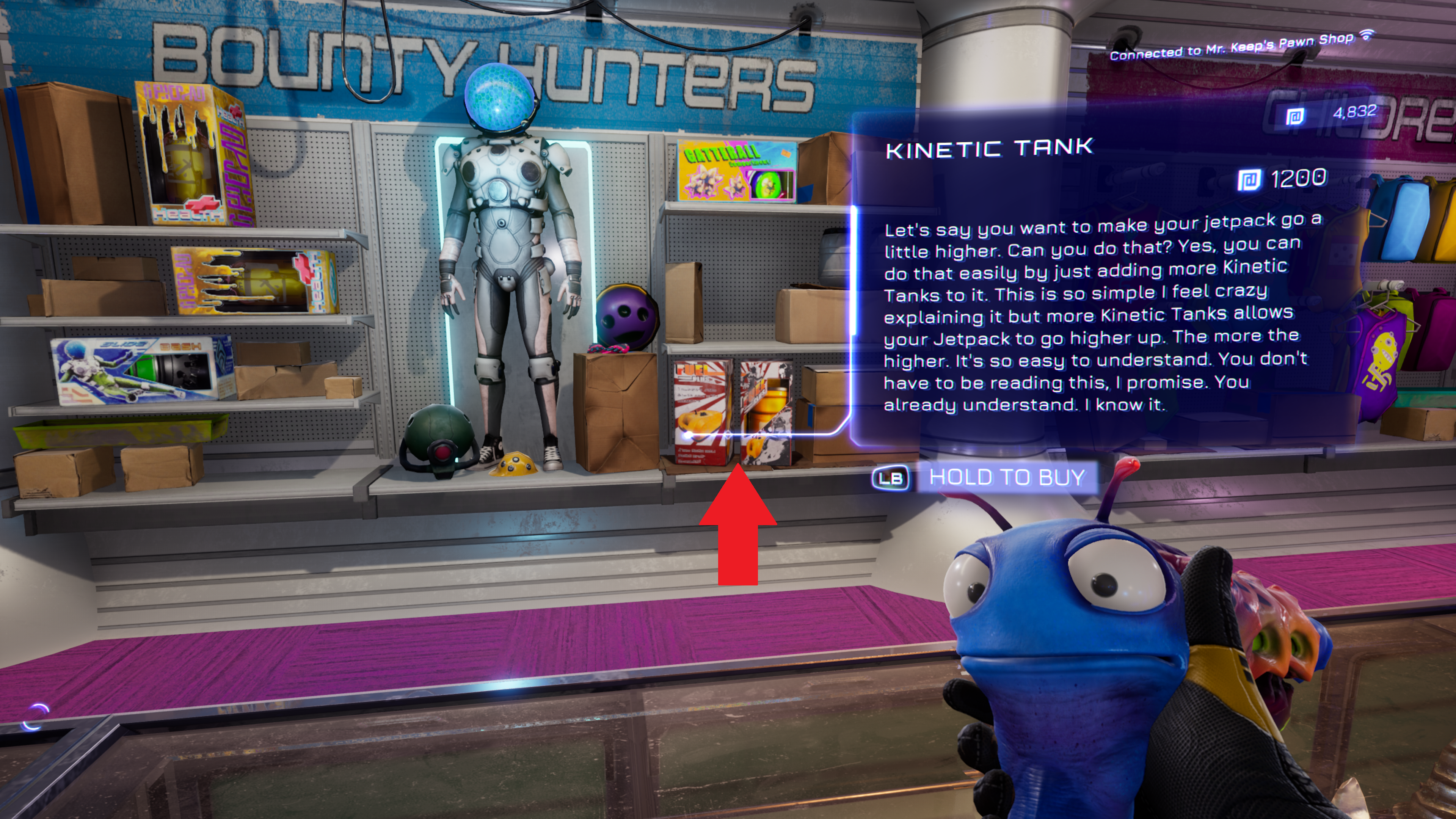 Finally, don’t sleep on the fact that you can buy upgrades for your jetpack. These are located right behind the counter in the pawn shop (directions in the passage before this!) the image above.