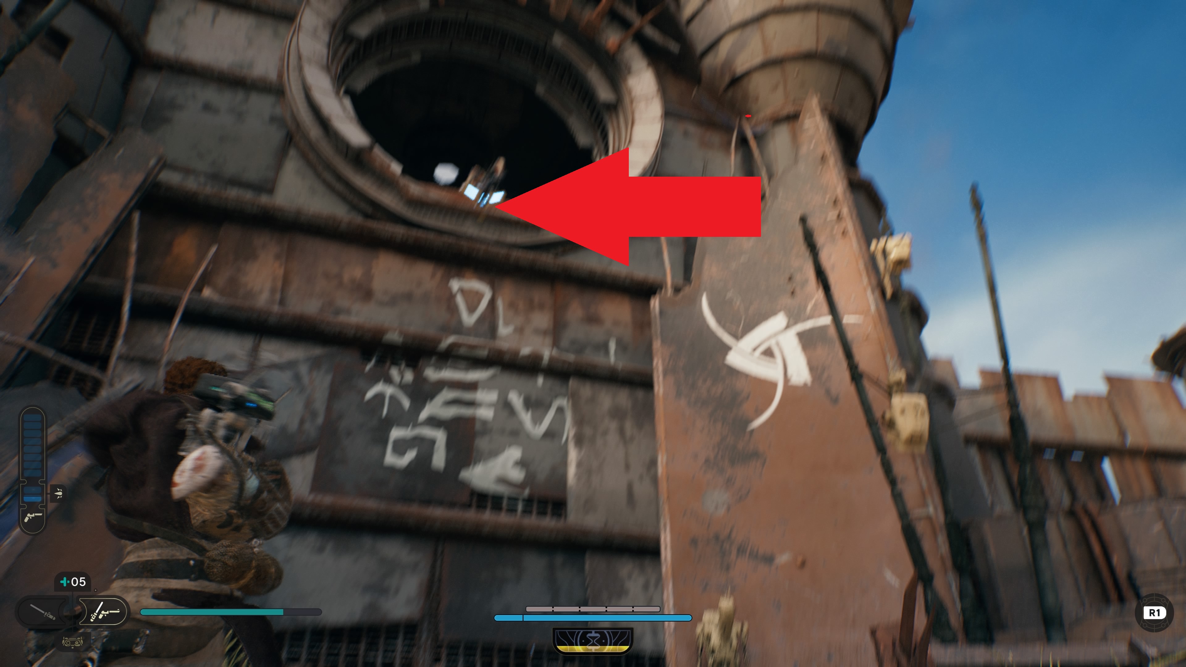 From the fast travel waypoint, head south into the fort and look up for a place to use the Ascension Cable (grappling hook). Veer left and make your way across a series of bridges until you come to a landing pad zone. Do not step on the landing pad until you’re ready to fall down and fight the ensuing miniboss.