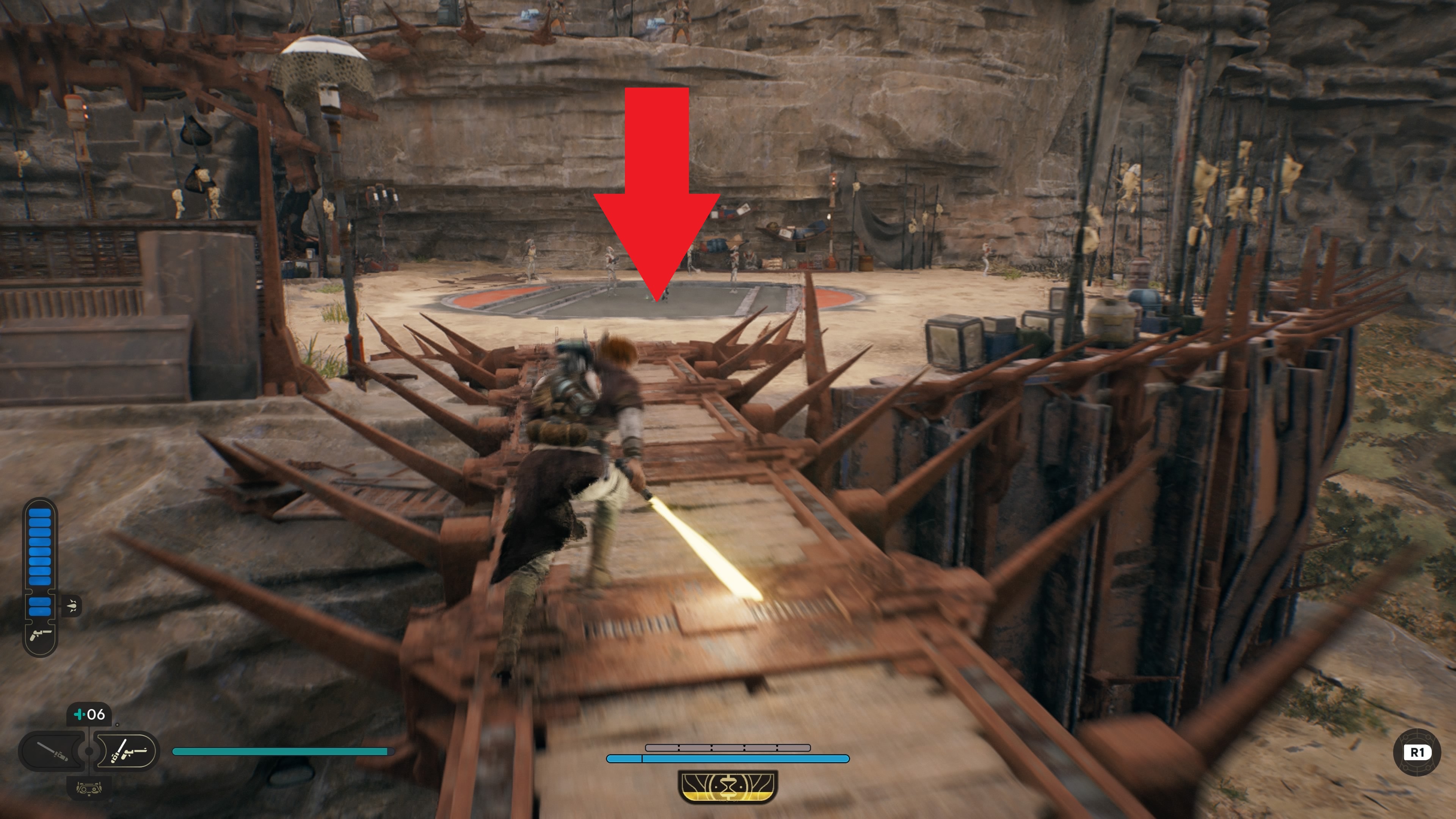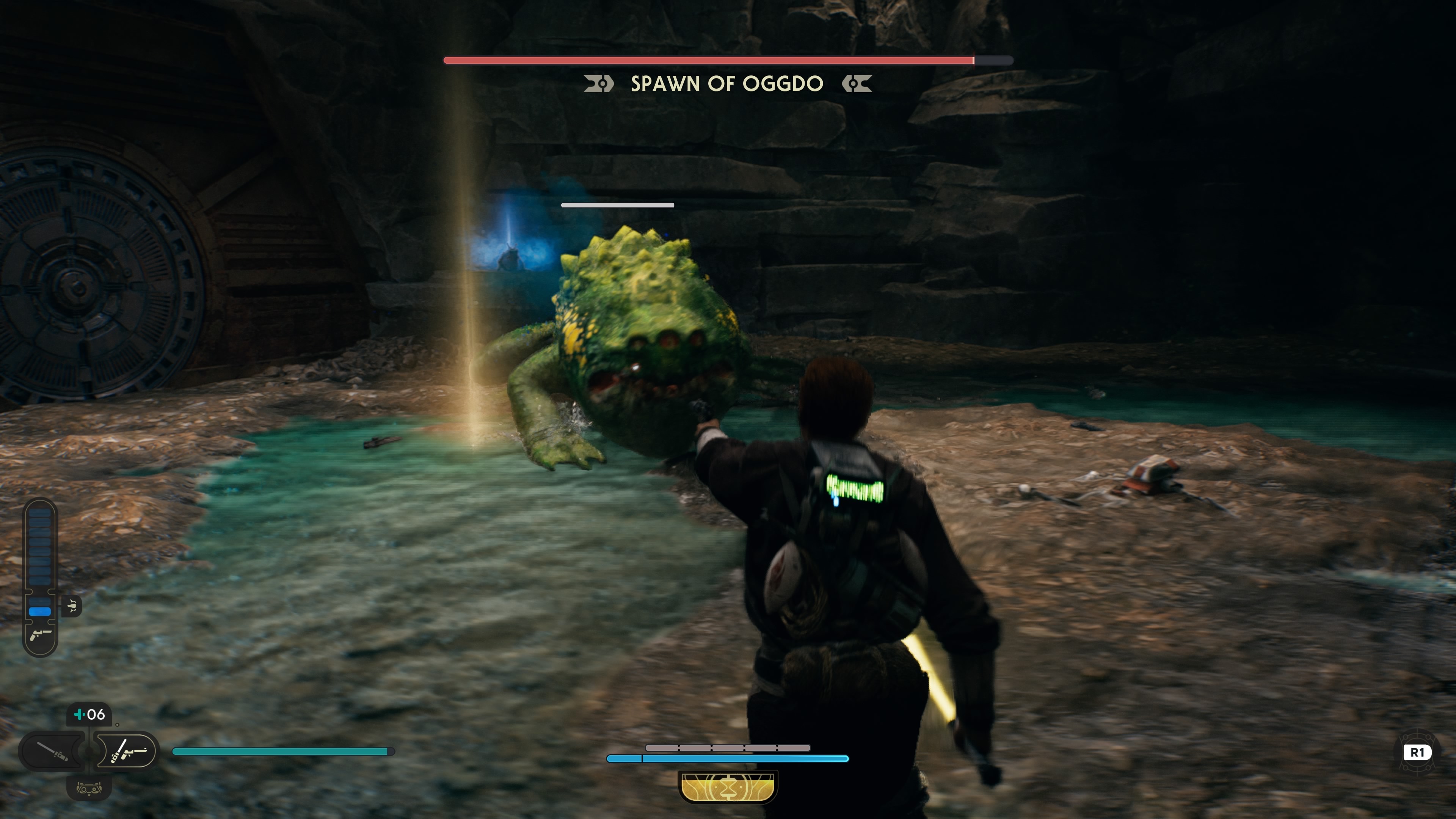 As a rule, you’ll want to bring the blaster style to take this one down easily. Fire off all of the blaster shots you have (going into the fight with a full magazine is ideal). Save your time slow ability (L3+R3) until you need to recharge some blaster shots: trigger it, run it, get a few potshots with your saber, then run back out.