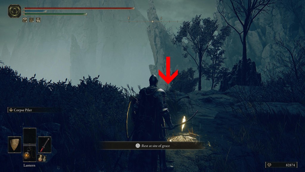 Now that you unlocked a new path, follow it and interact with the coffin at its end, which will trigger a cutscene and cause the Tarnished to go down to the area below. Once the cutscene is over, simply head toward the open area to spot the Castle Watering Hole Site of Grace.