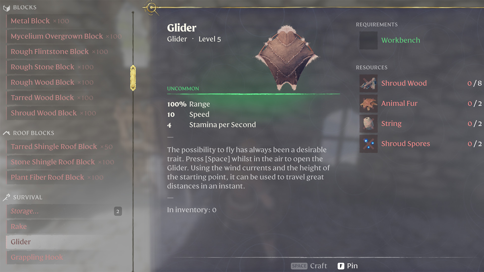 A word to the wise, don’t put off making your Glider in Enshrouded. I recommend making this the first thing you do after picking a spot to settle down with your first base. Flying makes quick work of once intimidating vallies, enemy camps, and any other obstacles you’d gladly ignore.