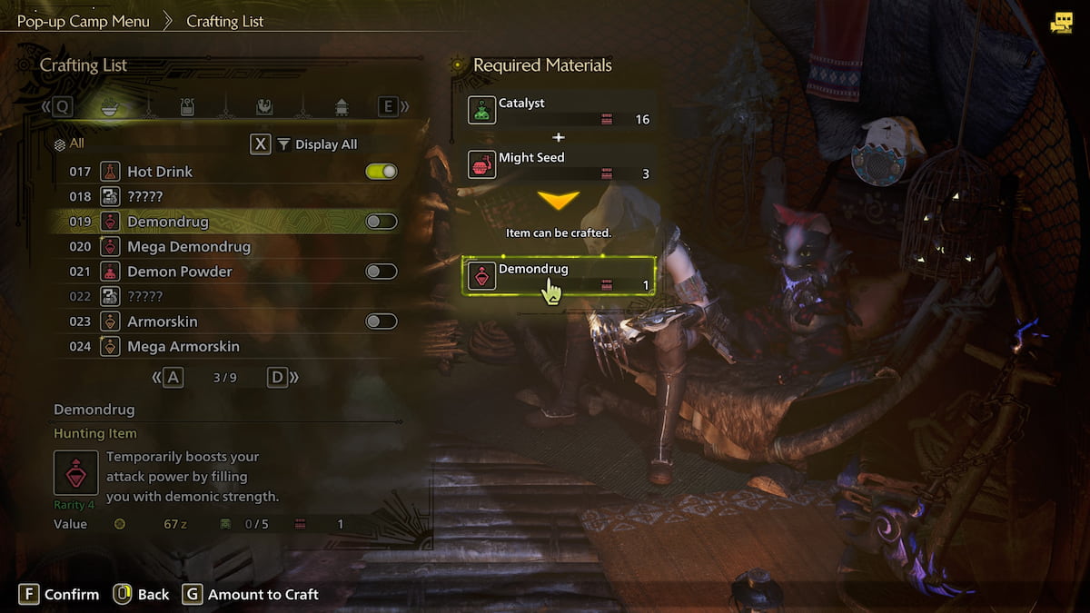 Once you have at least one Catalyst and Might Seed, you can craft Demondrug simliarly to how you crafted Catalyst initially. Open the Crafting List and scroll over to number 19 in the list. If you’ve not made Demondrug before, this will appear as simply question marks. Select the ‘?????’ and you’ll have crafted your very first Demondrug consumable.