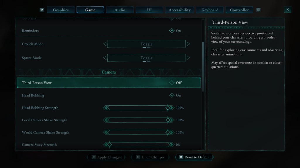 Another method to change to a third-person view is to go to ‘Settings,’ and tab over to ‘Game.’ Underneath the ‘Camera’ section, at the very top, you’ll find ‘Third-Person View.’ Toggle this to ‘On.’ Apply the settings and return to the game. You’ll now be able to see your character in all their glory, Godlike features and all.