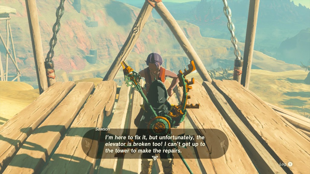 This tower requires a miniature sidequest to be completed before you can use it. Sawson, an NPC found at the bottom of a lift below the tower, needs help getting up to actually reach the Gerudo Canyon Skyview Tower.