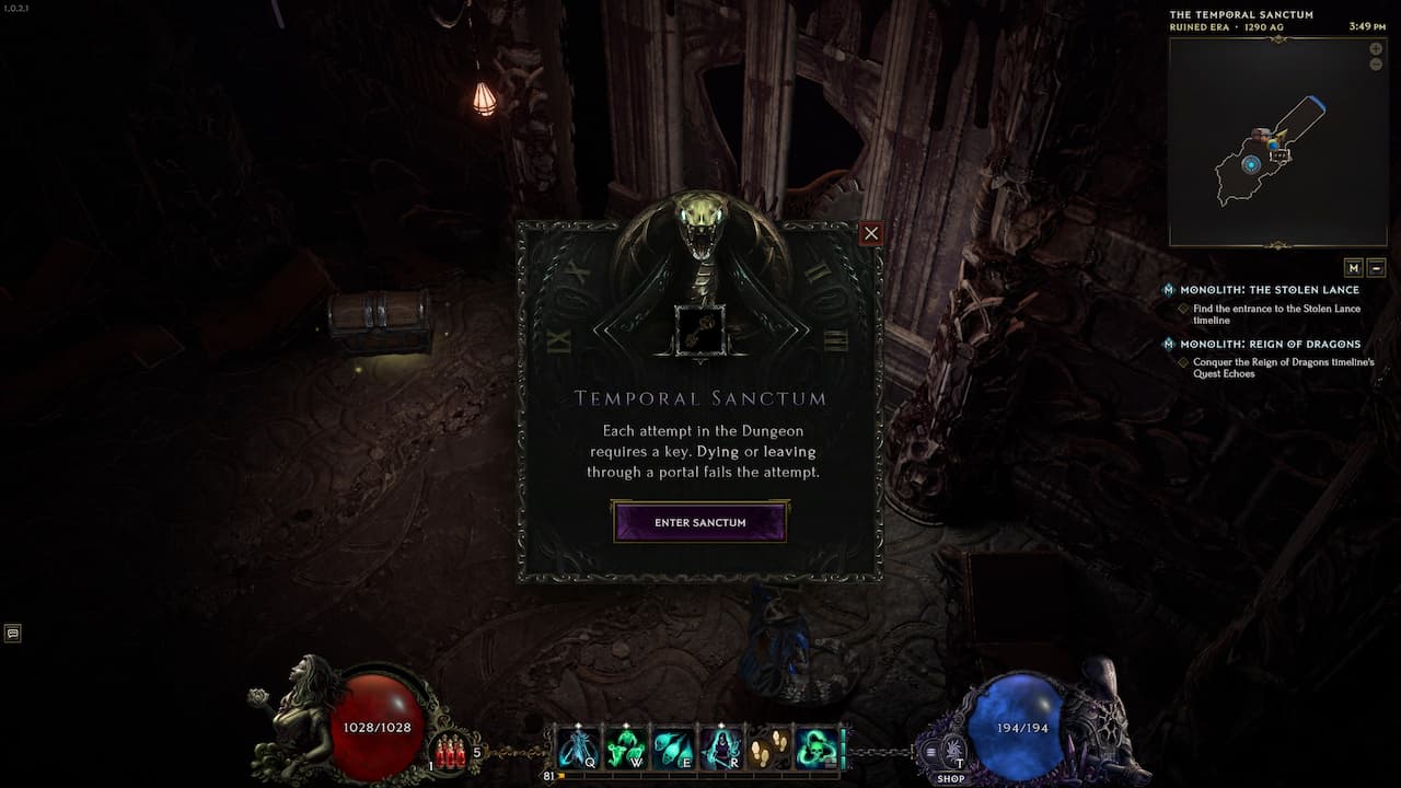 Before you worry about using the Eternity Cache in Last Epoch, you’ll have to locate it at the very end of the Temporal Sanctum dungeon. As with a few other dungeons, you’ll need a key to enter. Key drops are completely random, but much easier to find in the Monolith of Fate dungeons. Specifically, choosing quest echoes that offer keys should simplify the grind.