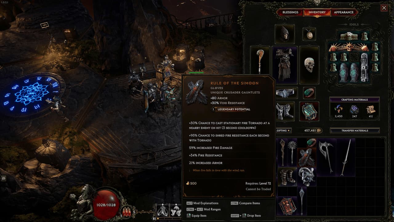 Moreover, the two pieces of gear will have to be of the same slot. For example, two sets of boots, helmets, etc. You can’t combine an amulet with a pair of gloves. After placing the proper items in the Eternity Cache and combining them, the Unique gear piece will take on a number of affixes from the Exalted piece, depending on its Legendary Potential.