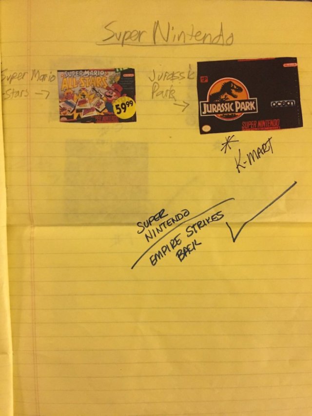 The Super Nintendo page is about as bare-bones as can be, with two very disparate outings front and center. Judging by my own memory, the asterisk, the “K-Mart” note, and the checkmark at the bottom, I can deduce that my parents went with Super Empire Strikes Back, which was not pictured.