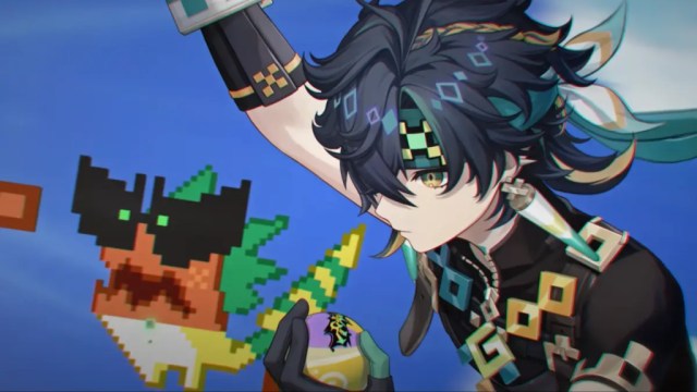 Kinich is the Dendro Claymore boy who was introduced alongside Mualani and Kachina in the last trailer. This time, he’s accompanied by a pixelated dragon companion named “Almighty Dragonlord (Self-Proclaimed)” K’uhul Ajaw. “Kinich” is part of the Yucatec name for the Mayan sun god, and the word “k’inich” itself appears to mean “sun-eyed.”