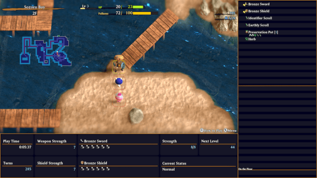 Roguelikes aren’t typically known for being friendly, but The Mystery Dungeon of Serpentcoil Island has some options to make the experience a little smoother. The mini-map lets you track your steps, projectiles and Staves can be assigned to a hotbar, and there’s a “Handy Dash” feature for speedier movement.