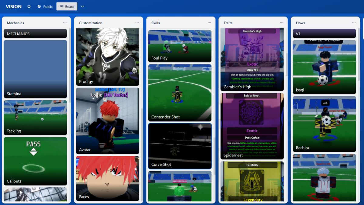 The Trello board for Roblox Vision will help you learn more about the game, especially regarding special moves and game mechanics. This way, you can learn how certain skills, like Curve Shot, work. I was mostly interested in learning more about traits and flows, as using them correctly can make a difference on the soccer field. Here’s everything you can find in this Trello: