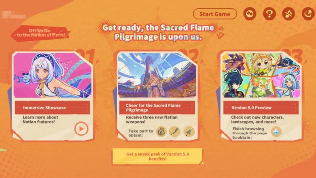 The Natlan-themed web event, titled “Off We Go to the Nation of Pyro!” lasts until September 24 and can be accessed via its official webpage. Wait for the page to load, then click or swipe through the animations to reach the end. You can also skip this initial showcase with a button in the top left corner. After getting through the showcase, there are two things you need to do to claim all of the web event rewards.