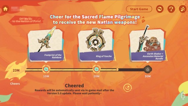 Scroll down or click on the middle tile to Cheer for the Sacred Flame Pilgrimage. This part of the web event will award the new Natlan weapons. To participate, log into your Genshin Impact account and press the Cheer button at the bottom. You’ll add anywhere between 1-8 Cheers to the total Cheer count. When the web event counts 30 million Cheers across all servers, all participants will receive three of the new craftable Natlan weapons at the start of Version 5.0, as well as some materials.