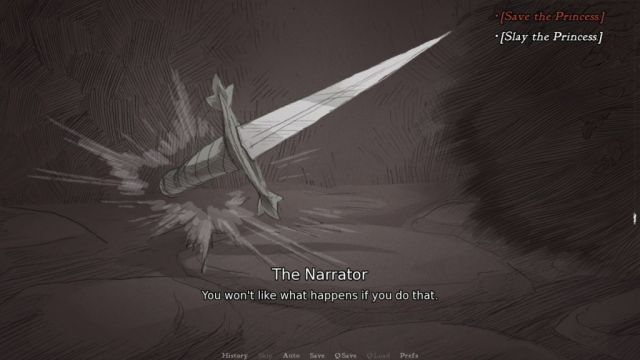 Slay the Princess is both easy to describe, and difficult to truly dig into. The best I can offer is a word-salad of genre titles and inspirations: horror meta-narrative visual novel with hand-drawn visuals and strong voice acting, something akin to The Stanley Parable meets Mundaun.
