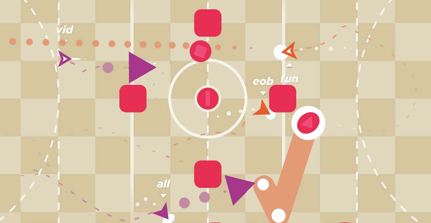 Following in the footsteps of other recent minimalist games like Divekick and Nidhogg, Videoball looks simple and straightforward at first glance but secretly conceals, switchblade-like, a staggering amount of depth and complexity. The game rules are easy enough to understand: you want to knock the ball into the enemy’s goal. You do this by hitting it with triangles. The longer you hold down a button, the bigger your triangle shot will be and the harder it will hit the ball. Hitting enemies with a triangle stuns them for a moment. Hitting teammates with triangles stuns them for a moment. Fair enough.