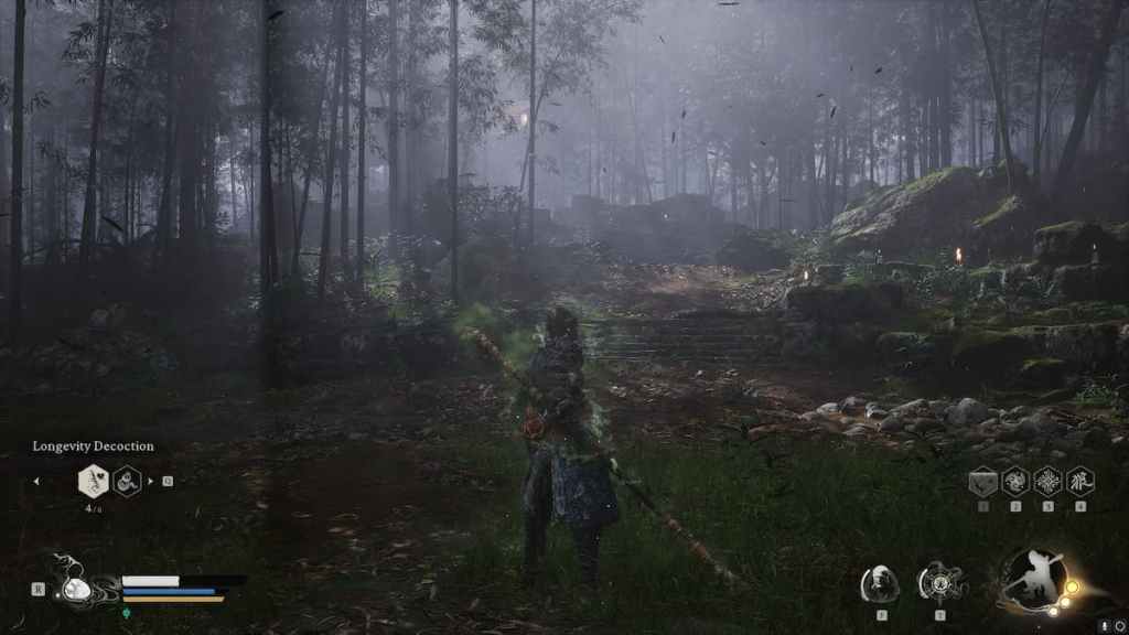 The first bell can be found very early in the game, at the arena where you fight Guangzhi and get access to his powerful staff. From the “Outside the Forest” Shrine at the Forest of Wolves, make your way forward and just follow the main path. Cross the bridge to the temple gate and head inside. If you’ve never fought Guangzhi before, you’ll need to take him out. If you already have, just ring the bell on the far side of the clearing and then you can be on your way.