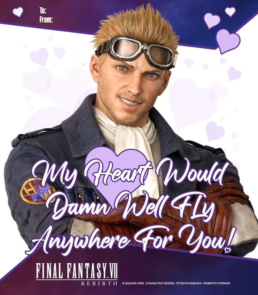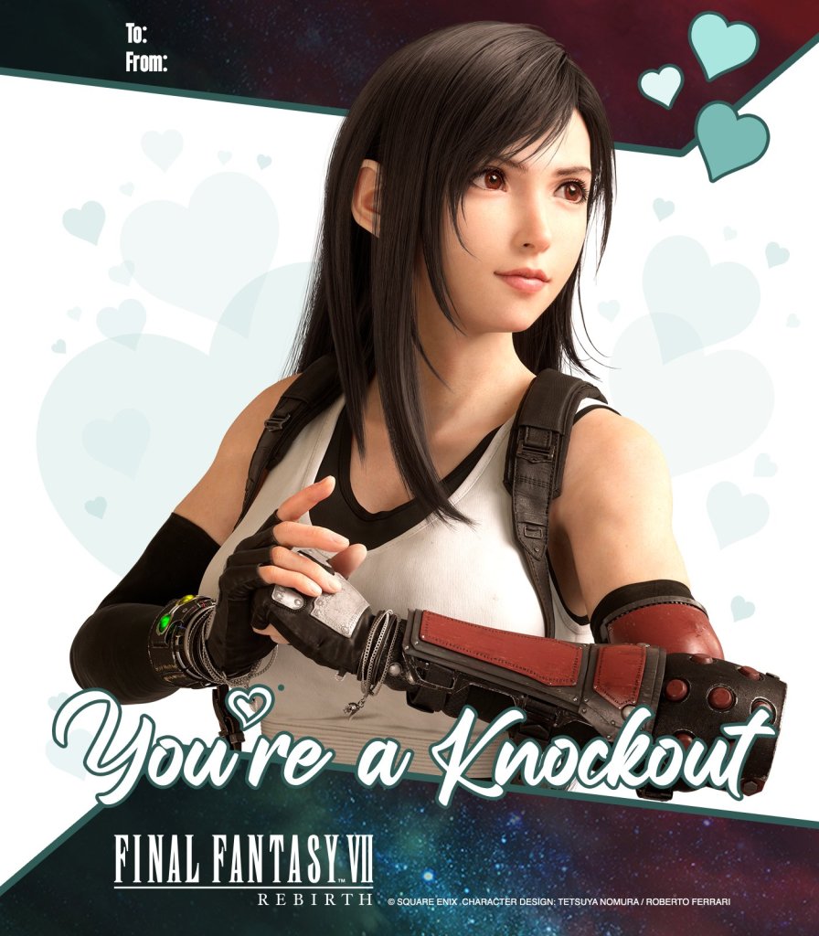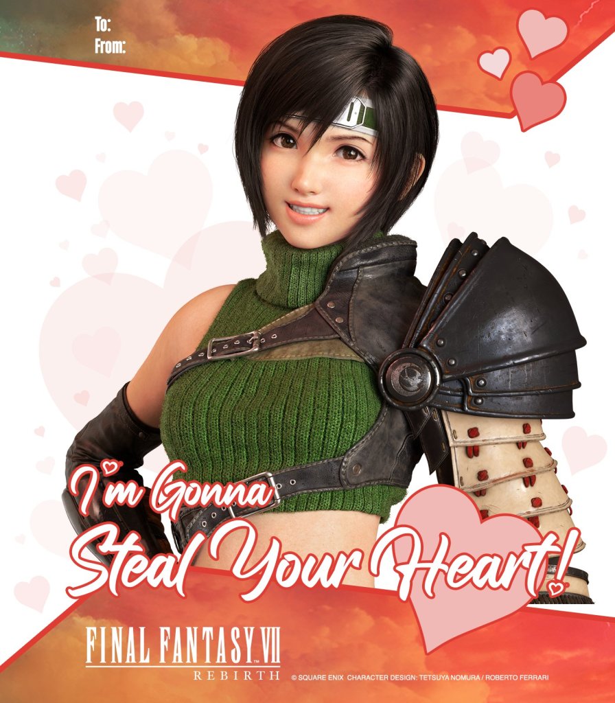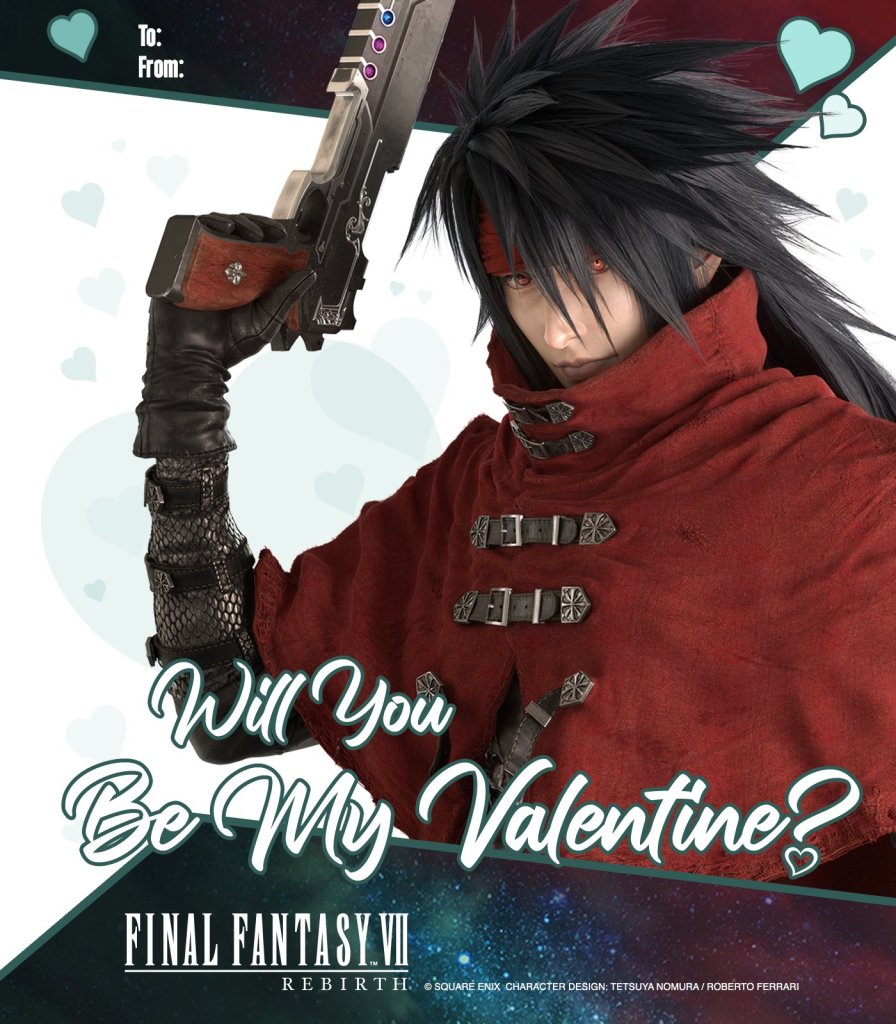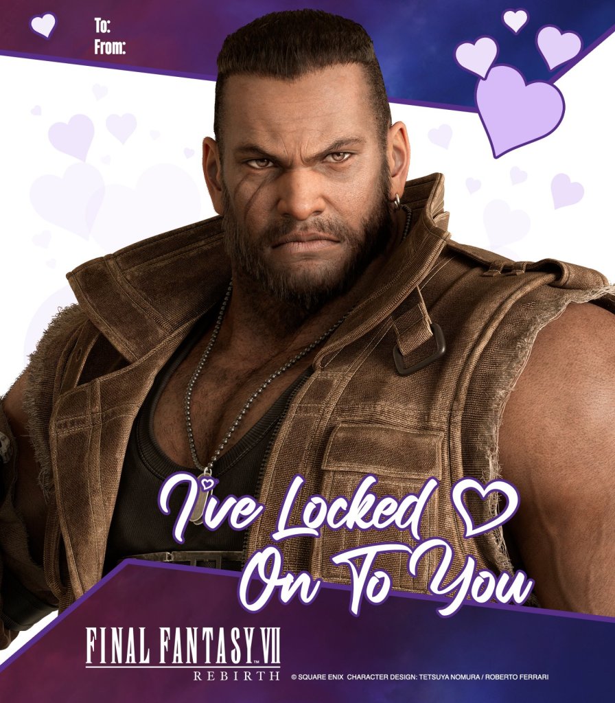 In a February 13, 2024, post on X (formerly Twitter), the Final Fantasy VII account made a series of Valentine’s cards available. Each card features one of the nine party members with an obligatory appearance by everyone’s favorite villain with mommy issues, Sephiroth.