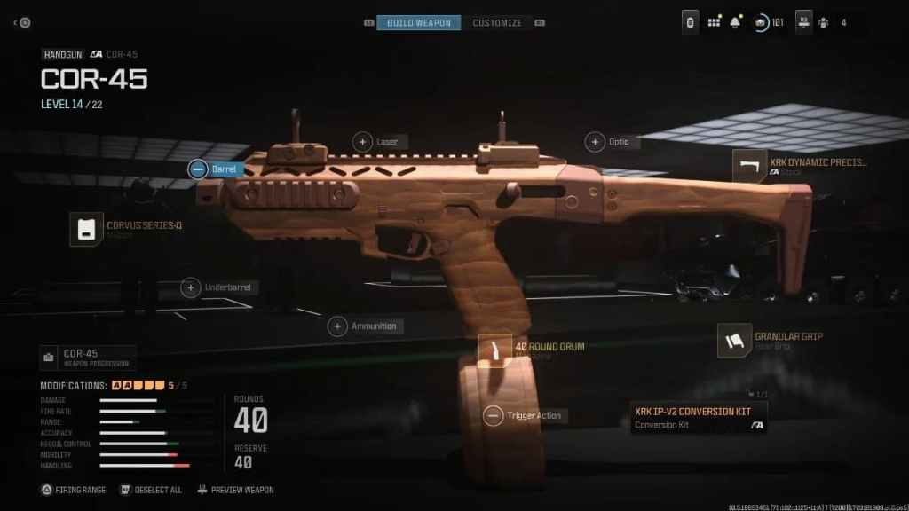 It all starts with the XRK IP-V2 Conversion Kit, which improves the pistol’s rate of fire by 100 percent, bullet velocity by 40 percent, damage range by 30 percent, and horizontal recoil by 69.8 percent at the cost of mobility.