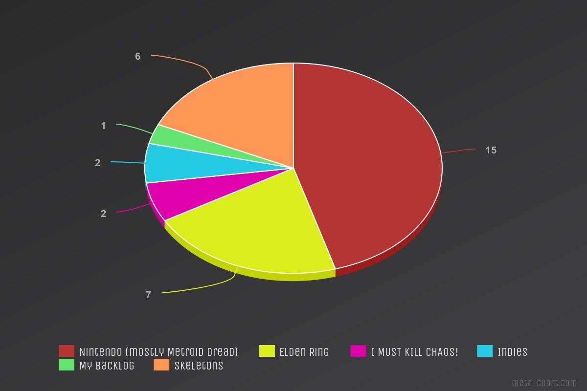 As you can see, Nintendo — possibly better known as Metroid Dread — is the clear winner. Something called Elden Ring follows that with a humble seven votes, but skeletons almost threatened to take its spot! Good thing Elden Ring likely also has skeletons. Actually, let’s just combine those two categories to give skeletons a fighting chance!