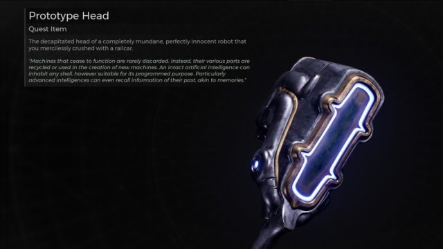While the same cannot be said about almost any other item in The Dark Horizon, it’s virtually impossible to miss the Prototype Head. Early on in the DLC, you’ll be riding a tram that basically crashes onto a poor, unsuspecting bot down below. Being the tenured Traveler that you are, you instinctively tear off its head and lug it around just in case it ends up being useful down the line. And, indeed, it does. Though it takes a while.