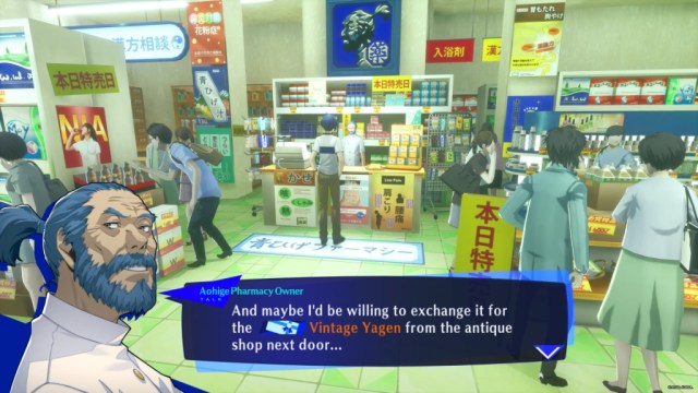 Fortunately, we know someone who used to sell Aojiru: the Pharmacist at Aohige Pharmacy. Go there, and he’ll offer to make it. But, not before you convince him to with a Vintage Yagen.