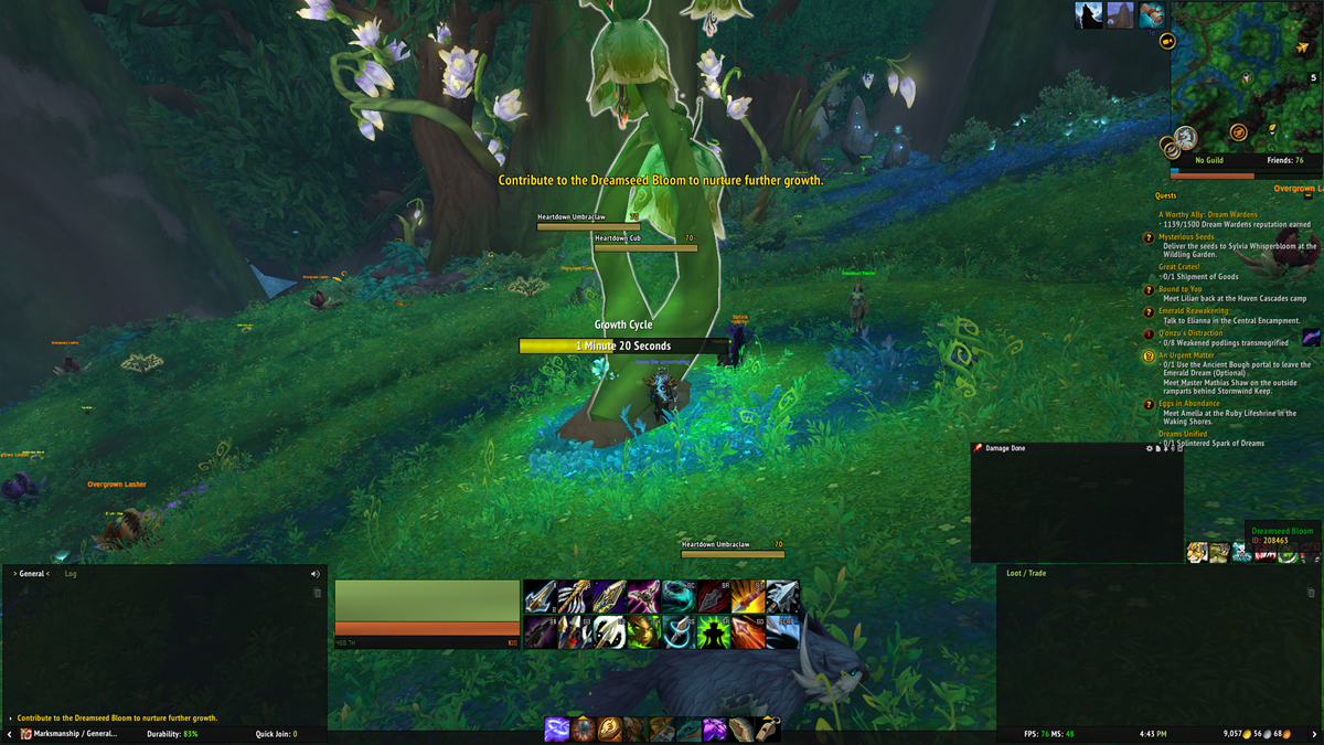 After this, any other players—yourself included if someone beat you to start the event—can contribute to growing the plant. You can then interact with the growing Emerald Bounty plant and contribute your own seeds (Epic, Rare, or Uncommon ones) toward the progress bar of the seed. You can also contribute Emerald Dewdrops which are obtained via quests, killing mobs and rare spawns, and opening treasures in Emerald Dream.